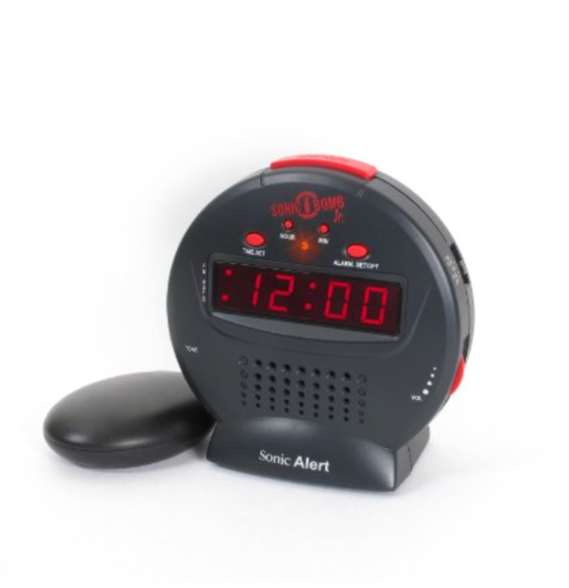 Mas foi com o “pai” do despertador acima, que encontrei meu par perfeito. O Sonic Bomb com Bed Shaker (chacoalhador de cama em tradução livre), também tem o alerta com luzes piscando, som bastante alto como o seu “filho” acima, mas é na hora de vibrar que ele faz toda a diferença.